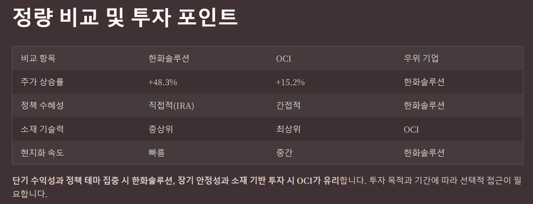 장기 안정성과 소재 경쟁력을 중시한다면 OCI가 유리합니다.