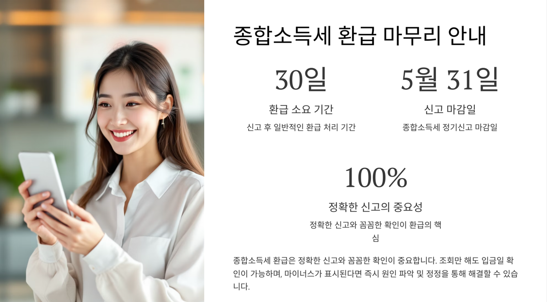 5월은 종합소득세 신고의 달입니다. 많은 분들이 환급금을 기대하면서 신고를 마무리하지만, 갑자기 ‘마이너스 환급금’이 뜨는 경우, 당황하기 마련입니다. 오늘은 종합소득세 환급금 조회 방법부터 입금일 확인, 그리고 마이너스가 발생하는 이유까지 차근히 정리해 드리겠습니다.