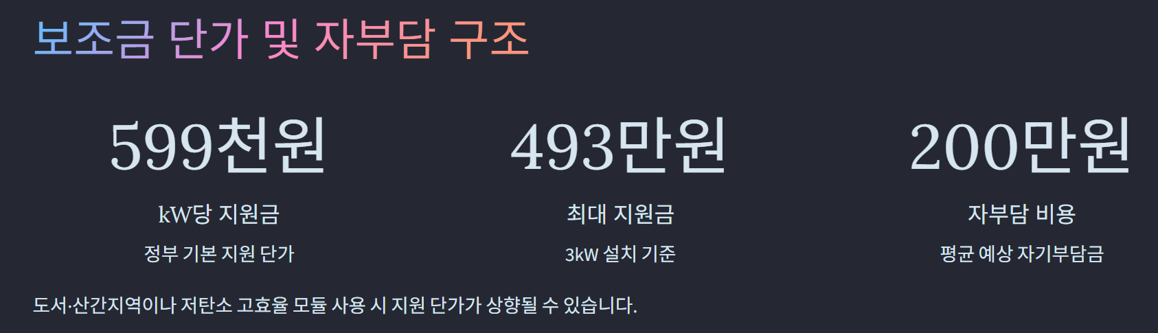- 보조금 단가: 3kW 기준, 1kW당 약 599천 원