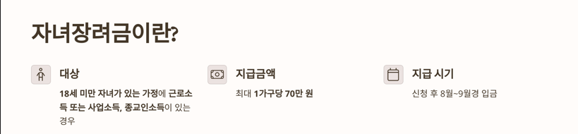 💡 자녀장려금은 홑벌이 또는 맞벌이 가구 기준으로 7,000만 원 미만이면 신청 가능